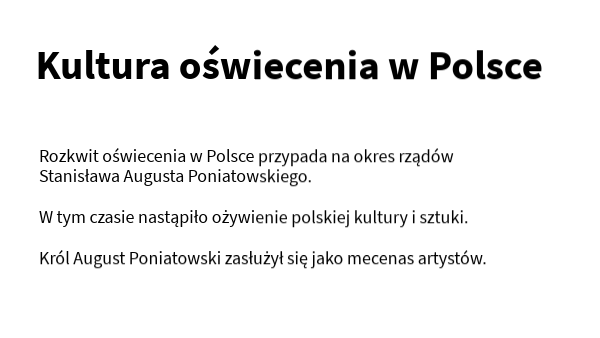 Rozkwit oświecenia w Polsce przypada na okres rządów Stanisława Augusta Poniatowskiego. W tym czasie nastąpiło ożywienie polskiej kultury i sztuki. Król August Poniatowski zasłużył się jako mecenas artystów.