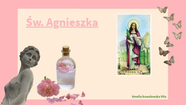Agnieszka była w starożytności jedną z najbardziej popularnych świętych miała zaledwie 12 lat.Jako 12-letnia dziewczynka, pochodząca ze starego rodu, miała ponieść męczeńską śmierć na stadionie Domicjana około 305 roku. przez ścięcie mieczem w Rzymie, później została nazwana jako Agnieszką Rzymską. W miejscu po jej męczeńskiej śmierci wybudowano kościół ku jej czci, zaś w IV w. cesarz Konstantyn Wielki w miejscu jej pochówku wystawił okazałą bazylikę