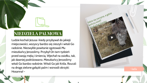 Ludzie kochali Jezusa i kiedy przybywał do jakiejś miejscowości, wszyscy bardzo się cieszyli i witali Go radośnie. Niezwykłe powitanie zgotowali Mu mieszkańcy Jerozolimy. Przybył On tam tydzień przed swoją męką i śmiercią. Wjechał na osiołku, tak, jak dawniej podróżowano. Mieszkańcy Jerozolimy witali Go bardzo radośnie. Witali Go jak Króla. Rzucali na drogę zielone gałązki palm i wznosili okrzyki: Hosanna! -