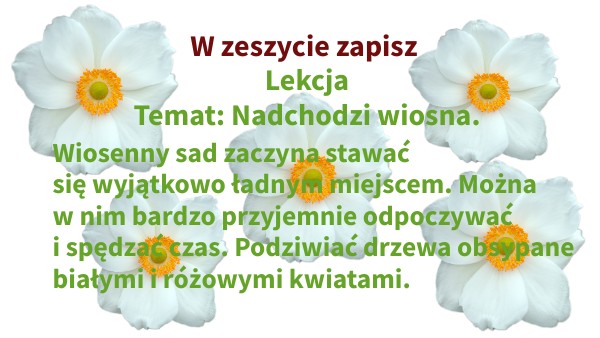 W zeszycie zapisz Lekcja Temat: Nadchodzi wiosna.