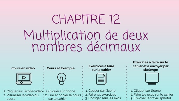 1) Tu fais ces exercices sur ton cahier, 2) Ensuite tu te connectes sur Skolengo. Tu y trouves un travail à faire " Chapitre 12"