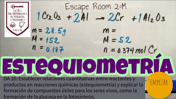 Se han robado el codigo secreto para entrar al laboratorio de ciencias del liceo de Hoteleria y Turismo.Con tus conocimientos y el apoyo de videos cumple las misiones sobre estequiometria