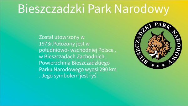 Został utowrzony w 1973r.Położony jest w południowo- wschodniej Polsce , w Bieszczadach Zachodnich . Powierzchnia Bieszczadzkiego Parku Narodowego wyosi 290 km . Jego symbolem jest ryś
