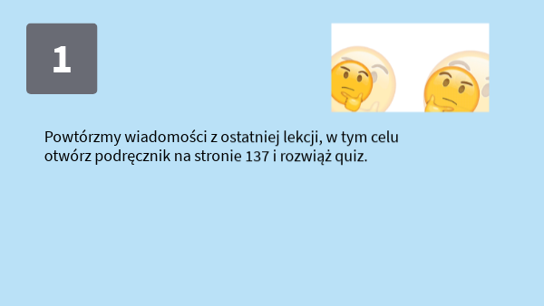 Powtórzmy wiadomości z ostatniej lekcji, w tym celu otwórz podręcznik na stronie 137 i rozwiąż quiz.
