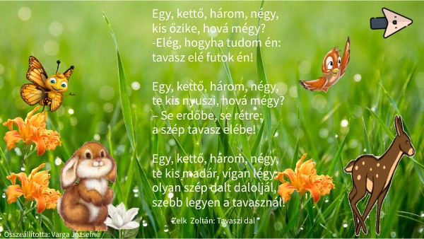 Egy, kettő, három, négy, kis őzike, hová mégy? -Elég, hogyha tudom én: tavasz elé futok én! Egy, kettő, három, négy, te kis nyuszi, hová mégy? – Se erdőbe, se rétre: a szép tavasz elébe! Egy, kettő, három, négy, te kis madár, vígan légy: olyan szép dalt daloljál, szebb legyen a tavasznál!