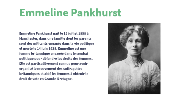 Emmeline Pankhurst naît le 15 juillet 1858 à Manchester, dans une famille dont les parents sont des militants engagés dans la vie politique et morte le 14 juin 1928. Emmeline est une femme britannique engagée dans le combat politique pour défendre les droits des femmes. Elle est particulièrement connue pour avoir organisé le mouvement des suffragettes britanniques et aidé les femmes à obtenir le droit de vote en Grande-Bretagne.