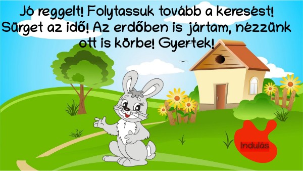 Jó reggelt! Folytassuk tovább a keresést! Sürget az idő! Az erdőben is jártam, nézzünk ott is körbe! Gyertek!
