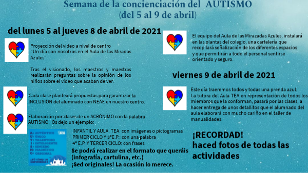 Este día traeremos todos y todas una prenda azul. La tutora del Aula TEA en representación de todos los miembros que la conforman, pasará por las clases, a hacer entrega de unos detallitos que el alumnado del aula elaborará con mucho cariño en el taller de manualidades.