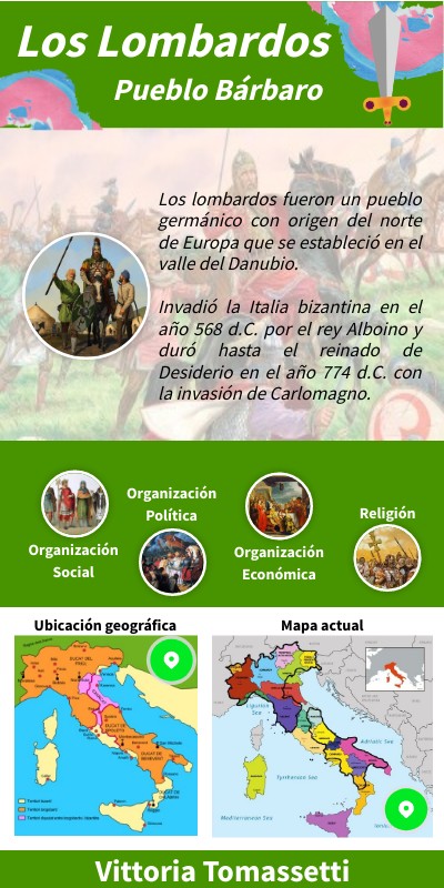 Los lombardos fueron un pueblo germánico con origen del norte de Europa que se estableció en el valle del Danubio. Invadió la Italia bizantina en el año 568 d.C. por el rey Alboino y duró hasta el reinado de Desiderio en el año 774 d.C. con la invasión de Carlomagno.