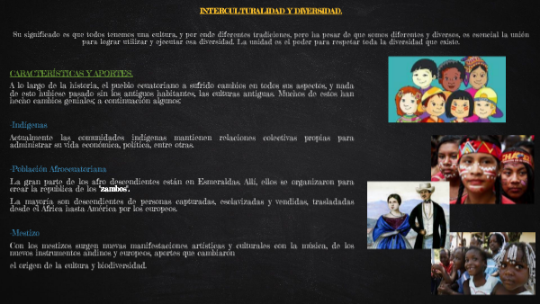 INTERCULTURALIDAD Y DIVERSIDAD. Su significado es que todos tenemos una cultura, y por ende diferentes tradiciones, pero ha pesar de que somos diferentes y diversos, es esencial la unión para lograr utilizar y ejecutar esa diversidad. La unidad es el poder para respetar toda la diversidad que existe.