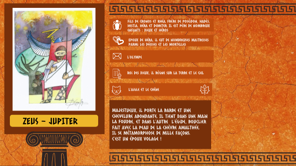 Majestueux, il porte la barbe et une chevelure abondante. Il tient dans une main la foudre, et dans l'autre l'égide, bouclier fait avec la peau de la chèvre Amalthée. Il se métamorphose de mille façons. C'est un époux volage !