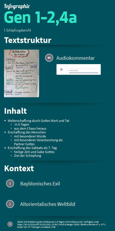 Göbel: Die Entstehung des Welthauses in 6 Tagen (online Ressource). Verfügbar unter https://bit.ly/2OSyUP0 (23.03.2021, 12:54); Preuß & Berger (2003): Bibelkunde des AT u. NT 1. Erster Teil: AT. Tübingen und Basel: UTB.