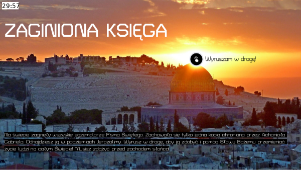 Na świecie zaginęły wszyskie egzemplarze Pisma Świętego. Zachowała się tylko jedna kopia chroniona przez Achanioła Gabriela. Odnajdziesz ją w podziemiach Jerozolimy. Wyrusz w drogę, aby ją zdobyć i pomóc Słowu Bożemu przemieniać życie ludzi na całym Świecie! Musisz zdążyć przed zachodem słońca!