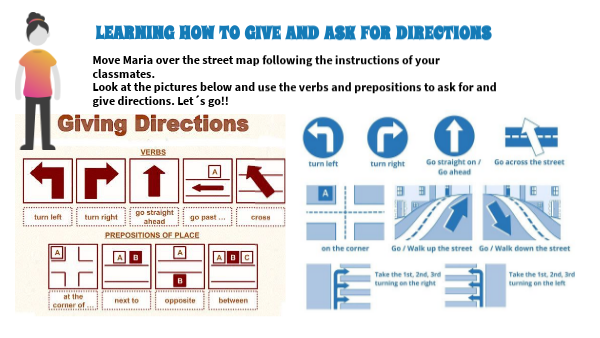 Move Maria over the street map following the instructions of your classmates. Look at the pictures below and use the verbs and prepositions to ask for and give directions. Let´s go!!