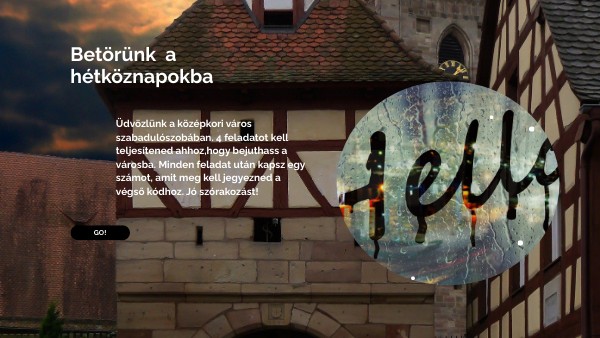Üdvözlünk a középkori város szabadulószobában. 4 feladatot kell teljesítened ahhoz,hogy bejuthass a városba. Minden feladat után kapsz egy számot, amit meg kell jegyezned a végső kódhoz. Jó szórakozást!
