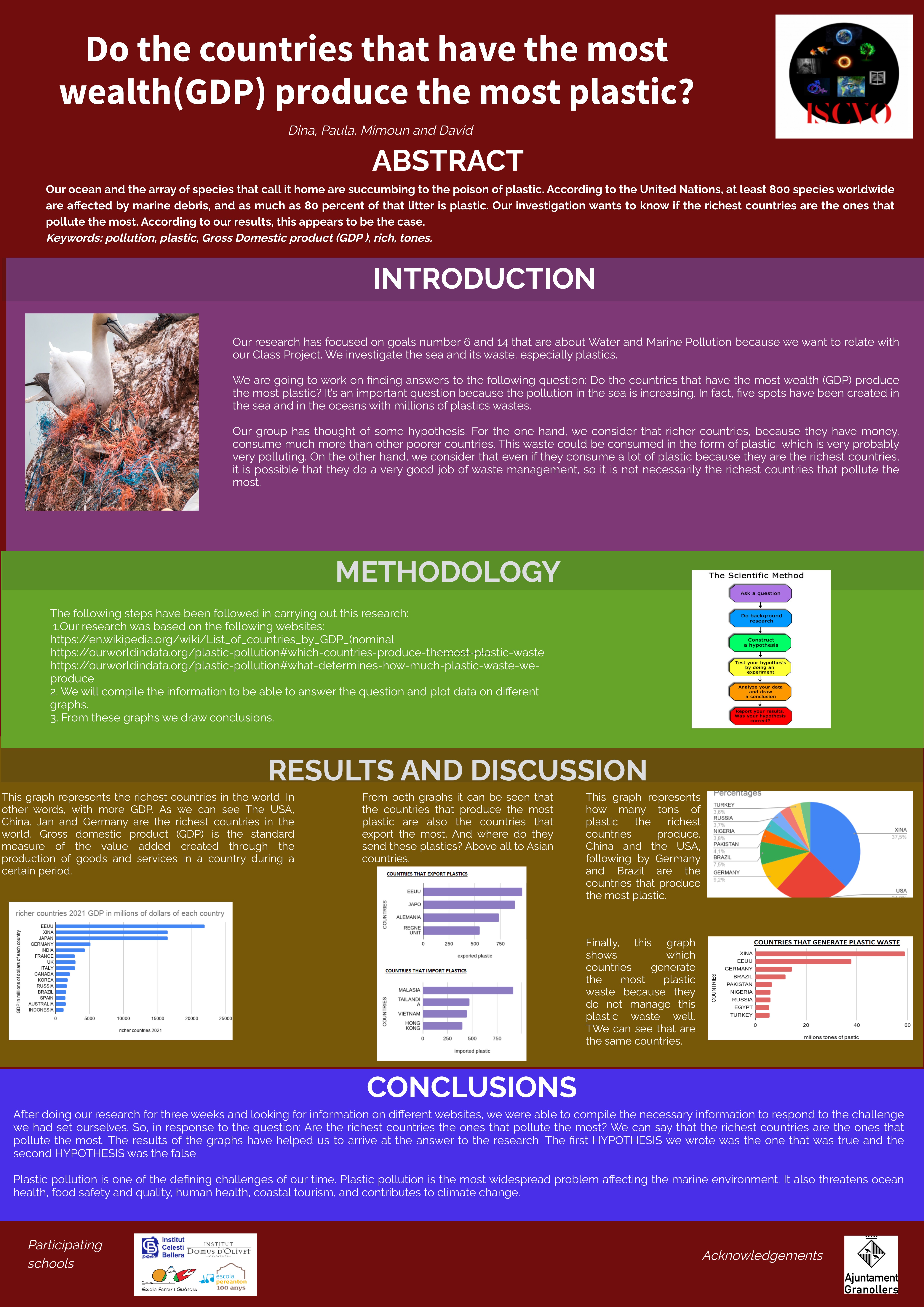 Our research has focused on goals number 6 and 14 that are about Water and Marine Pollution because we want to relate with our Class Project. We investigate the sea and its waste, especially plastics. We are going to work on finding answers to the following question: Do the countries that have the most wealth (GDP) produce the most plastic? It’s an important question because the pollution in the sea is increasing. In fact, five spots have been created in the sea and in the oceans with millions of plastics wastes. Our group has thought of some hypothesis. For the one hand, we consider that richer countries, because they have money, consume much more than other poorer countries. This waste could be consumed in the form of plastic, which is very probably very polluting. On the other hand, we consider that even if they consume a lot of plastic because they are the richest countries, it is possible that they do a very good job of waste management, so it is not necessarily the richest countries that pollute the most.