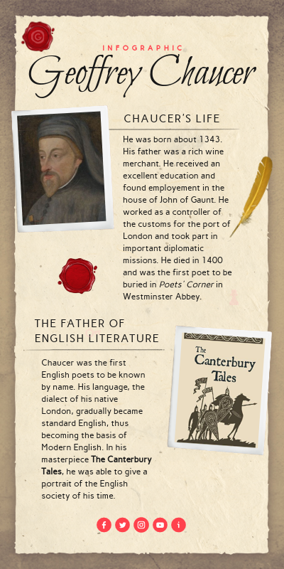 Chaucer was the first English poets to be known by name. His language, the dialect of his native London, gradually became standard English, thus becoming the basis of Modern English. In his masterpiece The Canterbury Tales, he was able to give a portrait of the English society of his time.