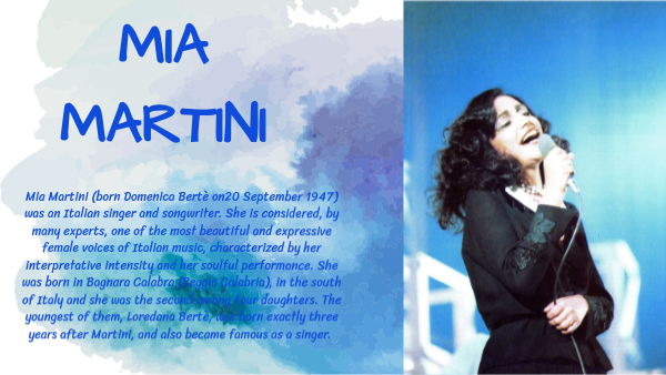Mia Martini was an Italian singer and songwriter. She is considered, by many experts, one of the most beautiful and expressive female voices of Italian music, characterized by her interpretative intensity and her soulful performance..