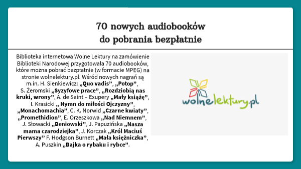 Biblioteka internetowa Wolne Lektury na zamówienie Biblioteki Narodowej przygotowała 70 audiobooków, które można pobrać bezpłatnie (w formacie MPEG) na stronie wolnelektury.pl. Wśród nowych nagrań są m.in. H. Sienkiewicz: „Quo vadis”, „Potop”, S. Żeromski „Syzyfowe prace”, „Rozdziobią nas kruki, wrony”, A. de Saint – Exupery „Mały książę”, I. Krasicki „ Hymn do miłości Ojczyzny”, „Monachomachia”, C. K. Norwid „Czarne kwiaty”, „Promethidion”, E. Orzeszkowa „Nad Niemnem”, J. Słowacki „Beniowski”, J. Papuzińska „Nasza mama czarodziejka”, J. Korczak „Król Maciuś Pierwszy” F. Hodgson Burnett „Mała księżniczka”, A. Puszkin „Bajka o rybaku i rybce”.