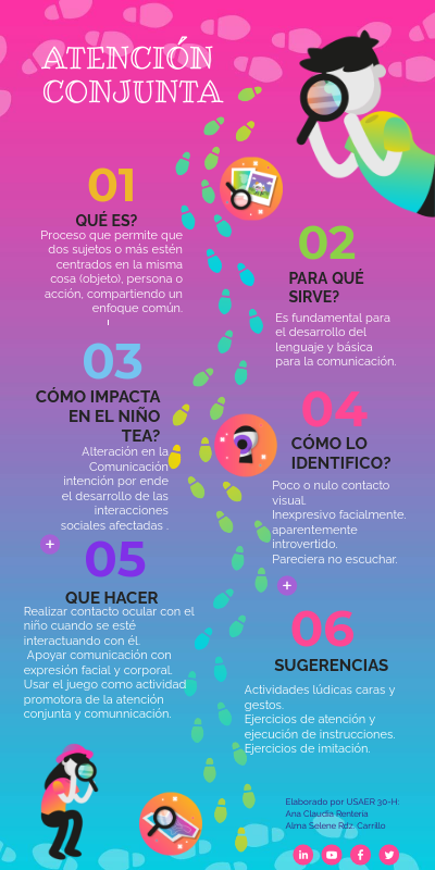 Realizar contacto ocular con el niño cuando se esté interactuando con él. Apoyar comunicación con expresión facial y corporal. Usar el juego como actividad promotora de la atención conjunta y comunnicación.