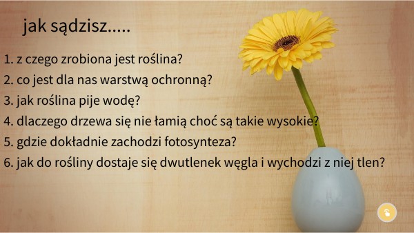 1. z czego zrobiona jest roślina? 2. co jest dla nas warstwą ochronną? 3. jak roślina pije wodę? 4. dlaczego drzewa się nie łamią choć są takie wysokie? 5. gdzie dokładnie zachodzi fotosynteza? 6. jak do rośliny dostaje się dwutlenek węgla i wychodzi z niej tlen?