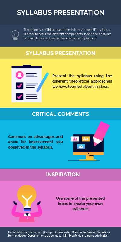 The objective of this presentation is to revise real-life syllabus in order to see if the different components, types and contents we have learned about in class are put into practice.