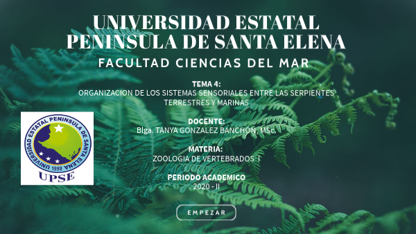 TEMA 4:ORGANIZACION DE LOS SISTEMAS SENSORIALES ENTRE LAS SERPIENTES TERRESTRES Y MARINAS DOCENTE:Blga. TANYA GONZALEZ BANCHON, MSc. MATERIA: ZOOLOGIA DE VERTEBRADOS I PERIODO ACADEMICO 2020 - II