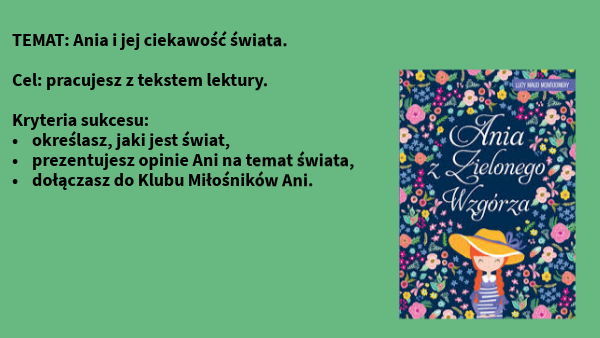 TEMAT: Ania i jej ciekawość świata. Cel: pracujesz z tekstem lektury. Kryteria sukcesu:• określasz, jaki jest świat,• prezentujesz opinie Ani na temat świata,• dołączasz do Klubu Miłośników Ani.
