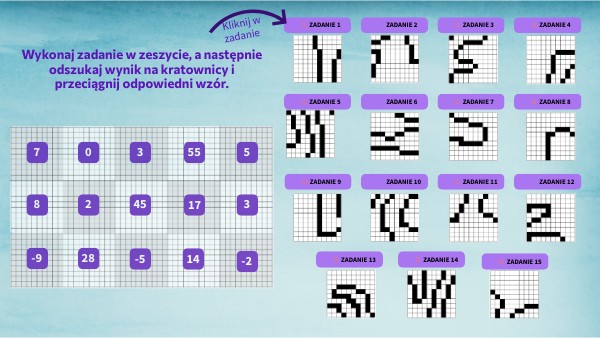 Wykonaj zadanie w zeszycie, a następnie odszukaj wynik na kratownicy i przeciągnij odpowiedni wzór.