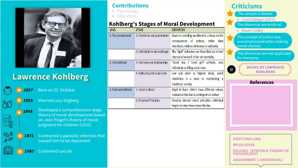 Developed a comprehensive stage theory of moral development based on Jean Piaget's theory of moral judgment for children (1932)