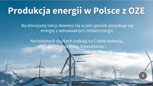 Na dzisiejszej lekcji dowiesz się w jaki sposób pozyskuje się energię z odnawialnych źródeł energii. Na kolejnych slajdach czekają na Ciebie zadania, quizy oraz filmy. Powodzenia !