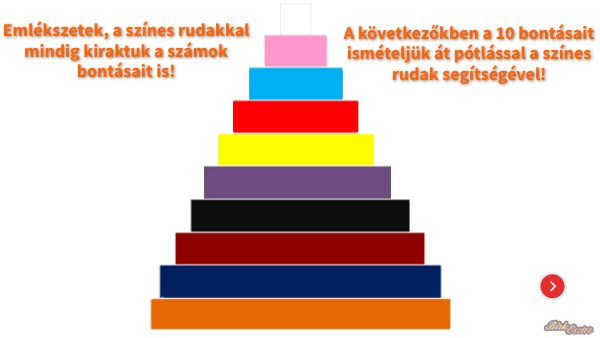 A következőkben a 10 bontásait ismételjük át pótlással a színes rudak segítségével!