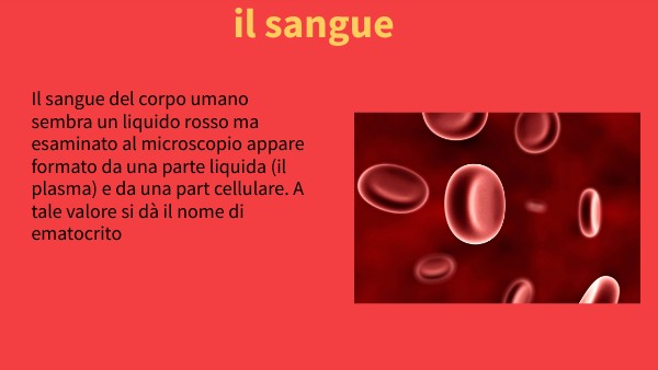 Il sangue del corpo umano sembra un liquido rosso ma esaminato al microscopio appare formato da una parte liquida (il plasma) e da una part cellulare. A tale valore si dà il nome di ematocrito
