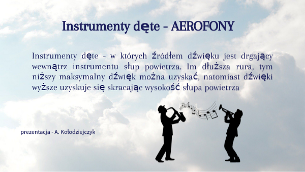 Instrumenty dęte - w których źródłem dźwięku jest drgający wewnątrz instrumentu słup powietrza. Im dłuższa rura, tym niższy maksymalny dźwięk można uzyskać, natomiast dźwięki wyższe uzyskuje się skracając wysokość słupa powietrza