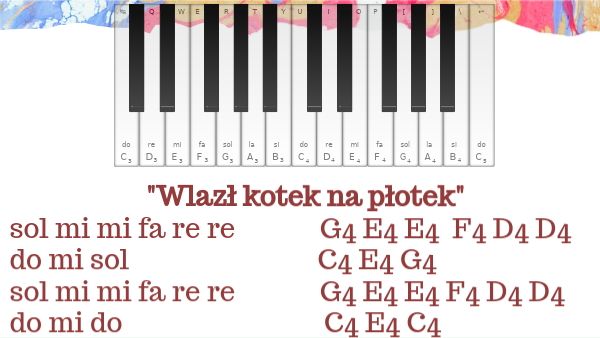 "Wlazł kotek na płotek"sol mi mi fa re re G4 E4 E4 F4 D4 D4 do mi sol C4 E4 G4 sol mi mi fa re re G4 E4 E4 F4 D4 D4 do mi do C4 E4 C4