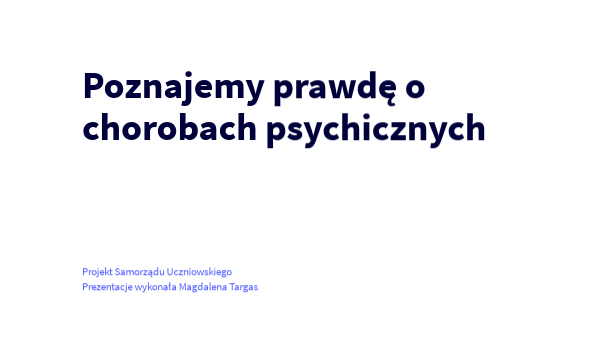 Czym są choroby psychiczne? Gdzie szukać pomocy? Dleczego choroby psychiczne są tematem tabu? Przedstawienie kilku chorób psychicznych, które napotykają młodzież Co powoduję to że młodzi ludzie są aż tak podatni na nałogi?