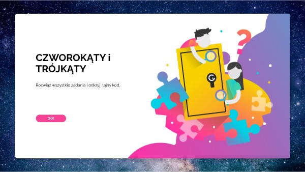 Drogi Uczniu,masz do wykonania misję: PRZYGOTOWĆ SIĘ DO SPRAWDZIANU Z MATEMATYKI Z DZIAŁU " TRÓJKĄTY I CZWOROKĄTY".Twoje zadanie polega na podjęciu czterech wyzwań. W każdym wyzwaniu musisz poprawnie rozwiązać zadania lub prawidłowo odpowiedziećna pytania.Po ukończeniu każdego wyzwania otrzymasz nagrodę w postaci cyfry. Zapamiętaj je!Na końcu będziesz musiał wprowadzić je w kolejności ich zdobycia, aby zakończyć grę i otrzymać nagrodę!