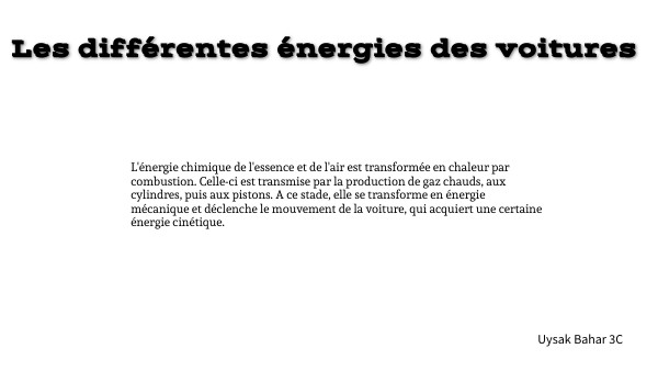 L'énergie chimique de l'essence et de l'air est transformée en chaleur par combustion. Celle-ci est transmise par la production de gaz chauds, aux cylindres, puis aux pistons. A ce stade, elle se transforme en énergie mécanique et déclenche le mouvement de la voiture, qui acquiert une certaine énergie cinétique.