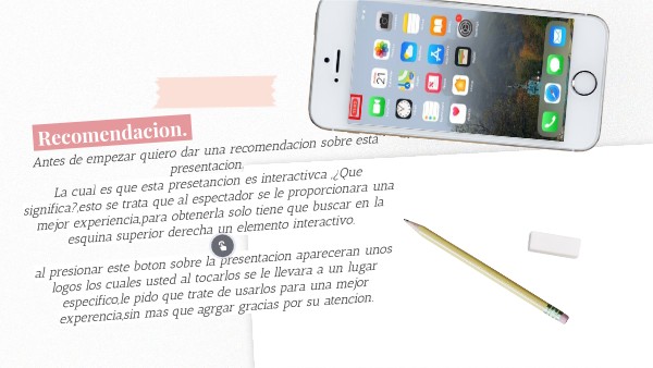 Antes de empezar quiero dar una recomendacion sobre esta presentacion.La cual es que esta presetancion es interactivca ,¿Que significa?,esto se trata que al espectador se le proporcionara una mejor experiencia,para obtenerla solo tiene que buscar en la esquina superior derecha un elemento interactivo. al presionar este boton sobre la presentacion apareceran unos logos los cuales usted al tocarlos se le llevara a un lugar especifico,le pido que trate de usarlos para una mejor experencia,sin mas que agrgar gracias por su atencion.