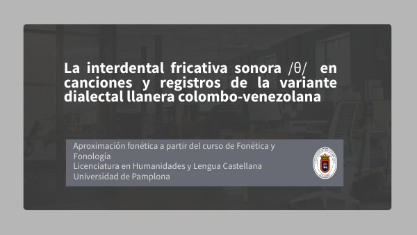 Este trabajo tienen como objetivo realizar una aproximación fonética a la consonante interdental fricativa /θ/ a partir de algunas canciones y registros sonoros de la variante dialectal llanera colombo-venezolana. Lo anterior, fruto del trabajo puesto para el curso de fonética y fonología de la Universidad de Pamplona.