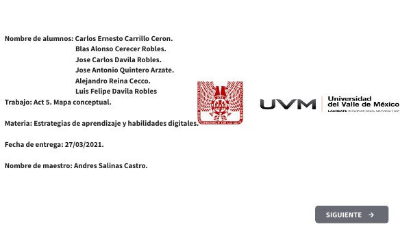 Nombre de alumnos: Carlos Ernesto Carrillo Ceron. Blas Alonso Cerecer Robles. Jose Carlos Davila Robles. Jose Antonio Quintero Arzate. Alejandro Reina Cecco. Luis Felipe Davila Robles Trabajo: Act 5. Mapa conceptual. Materia: Estrategias de aprendizaje y habilidades digitales. Fecha de entrega: 27/03/2021. Nombre de maestro: Andres Salinas Castro.