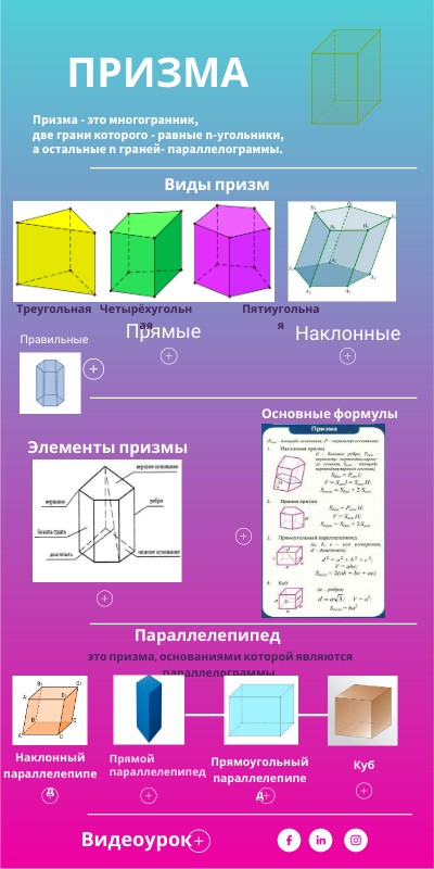 Призма - это многогранник, две грани которого - равные n-угольники, а остальные n граней- параллелограммы.