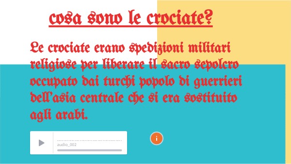Le crociate erano spedizioni militari religiose per liberare il sacro sepolcro occupato dai turchi popolo di guerrieri dell'asia centrale che si era sostituito agli arabi.