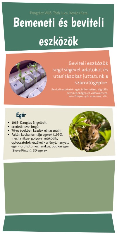 Beviteli eszközök: egér, billentyűzet, digitális fényképezőgép és videokamera, érintőképernyő, szkenner, stb.