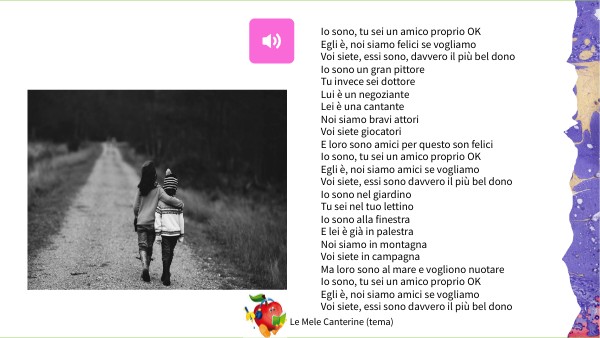 Io sono, tu sei un amico proprio OK Egli è, noi siamo felici se vogliamo Voi siete, essi sono, davvero il più bel dono Io sono un gran pittore Tu invece sei dottore Lui è un negoziante Lei è una cantante Noi siamo bravi attori Voi siete giocatori E loro sono amici per questo son felici Io sono, tu sei un amico proprio OK Egli è, noi siamo amici se vogliamo Voi siete, essi sono davvero il più bel dono Io sono nel giardino Tu sei nel tuo lettino Io sono alla finestra E lei è già in palestra Noi siamo in montagna Voi siete in campagna Ma loro sono al mare e vogliono nuotare Io sono, tu sei un amico proprio OK Egli è, noi siamo amici se vogliamo Voi siete, essi sono davvero il più bel dono