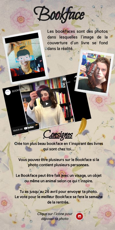 Crée ton plus beau bookface en t'inspirant des livres qui sont chez toi... Vous pouvez être plusieurs sur le Bookface si la photo contient plusieurs personnes. Le Bookface peut être fait avec un visage, un objet ou même un animal selon ce qui t'inspire. Tu as jusqu'au 26 avril pour envoyer ta photo. Le vote pour le meilleur Bookface se fera la semaine de la rentrée.