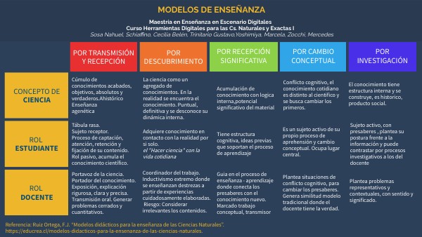 Referencia: Ruiz Ortega, F.J. “Modelos didácticos para la enseñanza de las Ciencias Naturales”.https://educrea.cl/modelos-didacticos-para-la-ensenanza-de-las-ciencias-naturales.