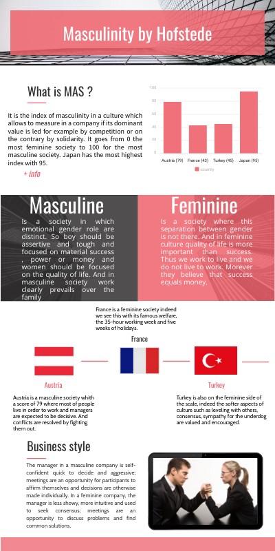 Is a society in which emotional gender role are distinct. So boy should be assertive and tough and focused on material success , power or money and women should be focused on the quality of life. And in masculine society work clearly prevails over the family