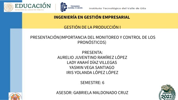 INGENIERÍA EN GESTIÓN EMPRESARIAL GESTIÓN DE LA PRODUCCIÓN I presentación(importancia del monitoreo y control de los pronósticos) PRESENTA: Aurelio Juventino Ramírez López Lady Anahí Díaz Villegas Yasmin Vega Santiago Iris Yolanda López López SEMESTRE: 6 ASESOR: GABRIELA MALDONADO CRUZ Santiago Suchilquitongo, Etla Oaxaca Marzo 2021