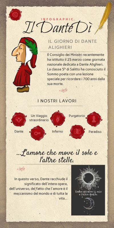 Il Consiglio dei Ministri recentemente ha istituito il 25 marzo come giornata nazionale dedicata a Dante Alighieri. La classe 5^ di Salitto ha conosciuto il Sommo poeta con una lezione speciale per ricordare i 700 anni dalla sua morte.